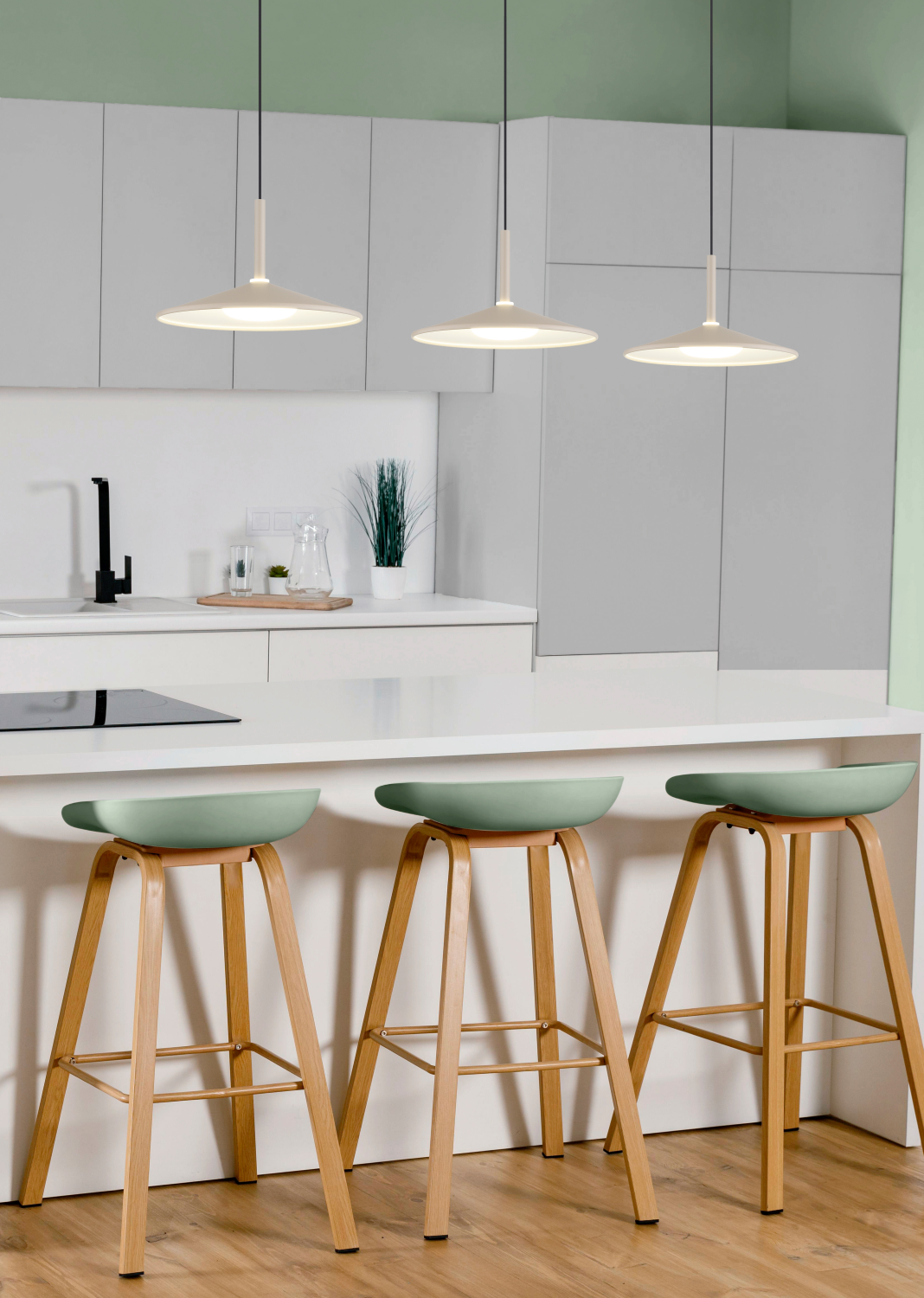 Eine Kochinsel wird in immer mehr Wohnungen und Häusern zum Zentrum der Küche; sei es als Arbeitsfläche, Treffpunkt oder Theke. Entsprechend verdient sie ein eigenes Beleuchtungskonzept. Pendelleuchten über der Insel sind ein sicherer Tipp: Sie spenden gerichtetes Licht zum Arbeiten oder Essen und dienen gleichzeitig als dekorativer Blickfang im Raum. Planen Sie zwei bis drei Pendel in gleichmäßigem Abstand über der Insel ein, je nach Inselgröße. Wichtig ist eine passende Höhe (etwa 60–70cm über der Arbeitsplatte), damit niemand geblendet wird und das Licht den Bereich breit ausleuchtet. Ideal sind dimmbare Pendelleuchten, denn sie können für gesellige Runden gedimmt oder für Küchenarbeiten aufgehellt werden. Auch das Lichtfarbe-Konzept darf mitbedacht werden: Neutralweißes Licht (etwa 4000K) hilft beim konzentrierten Zubereiten, während warmweißes Licht (etwa 2700K) zu später Stunde eine gemütliche Stimmung erzeugt.